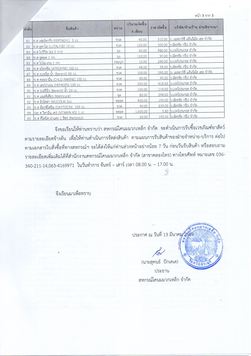 ประกาศ เรื่อง ผลการจัดซื้อเวชภัณฑ์ยาสัตว์ ด้วยวิธีประกวดราคา ระยะเวลา 4 เดือน (ตั้งแต่วันที่ 1 เม.ย. - 31 ก.ค. 69)