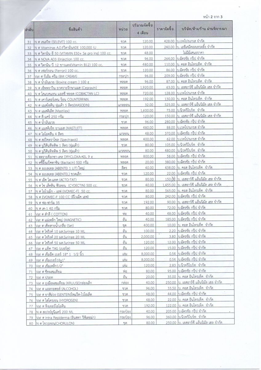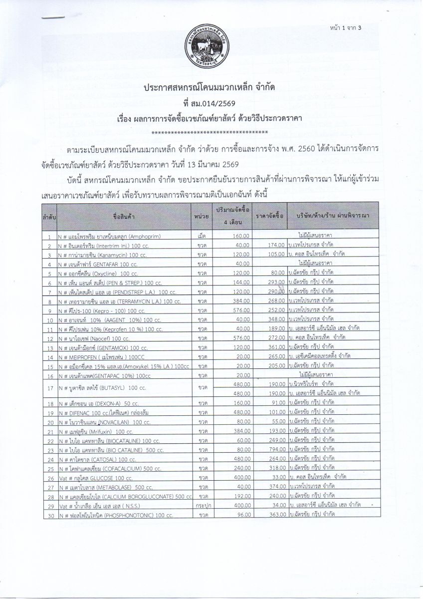 ประกาศ เรื่อง ผลการจัดซื้อเวชภัณฑ์ยาสัตว์ ด้วยวิธีประกวดราคา ระยะเวลา 4 เดือน (ตั้งแต่วันที่ 1 เม.ย. - 31 ก.ค. 69)