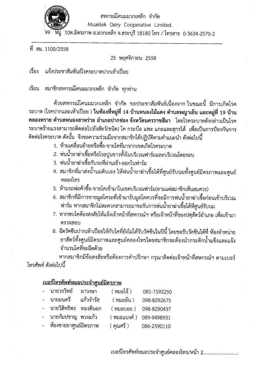 แจ้งประกาศเกี่ยวกับโรคระบาดปากเท้าเปื่อย