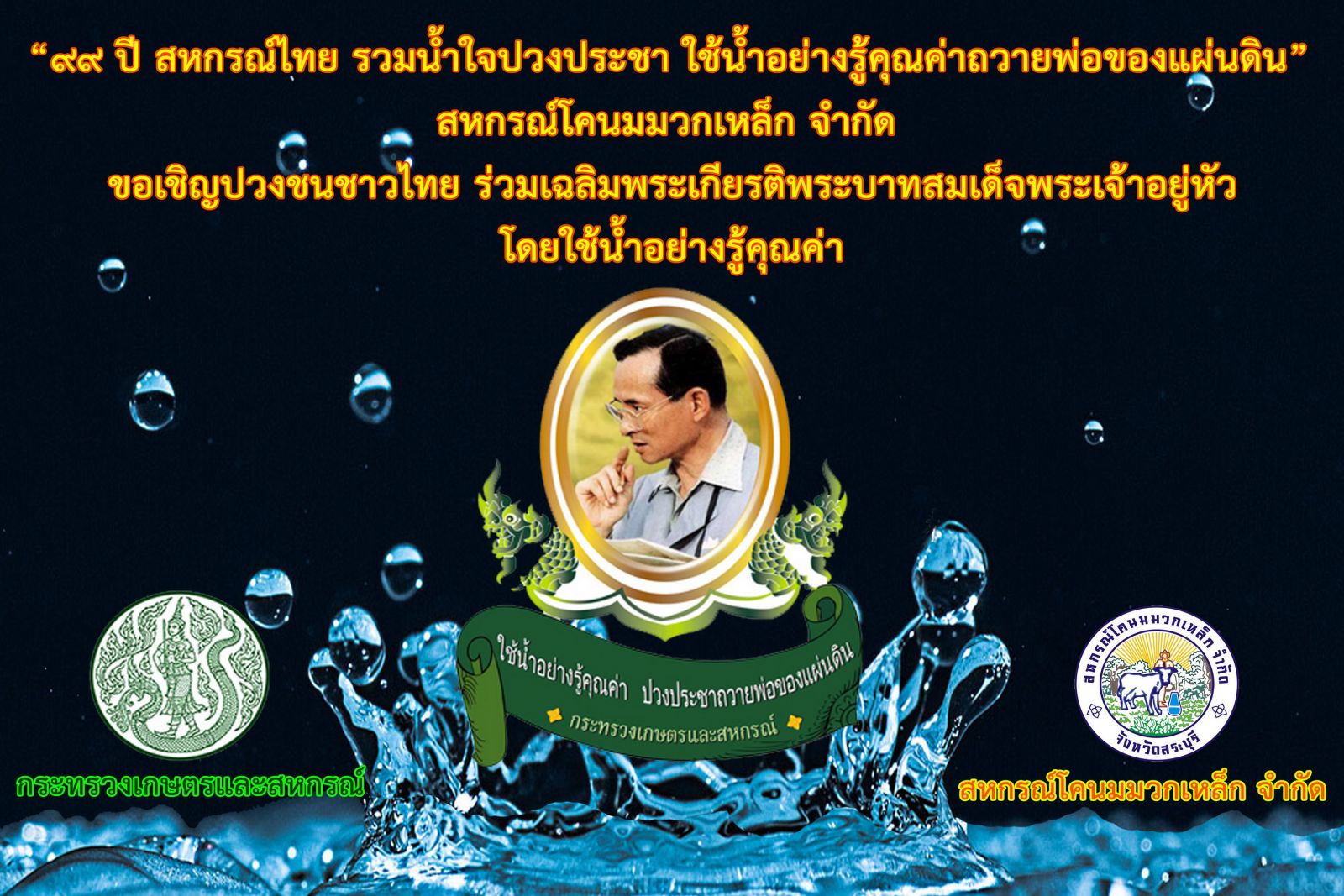 "๙๙ ปี สหกรณ์ไทย รวมน้ำใจปวงประชา ใช้น้ำอย่างรู้คุณค่าถวายพ่อของแผ่นดิน"