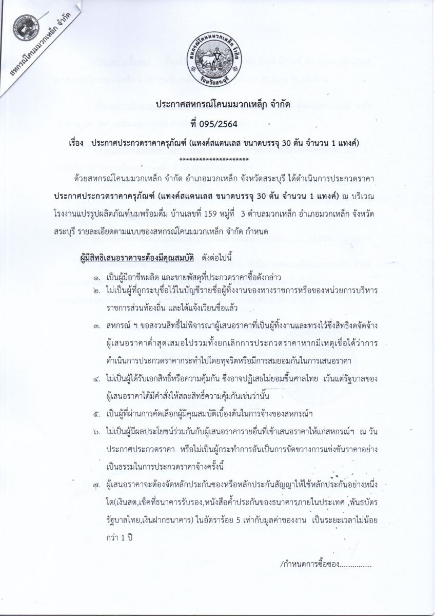 เรื่อง : ประกาศ ประกวดราคาครุภัณฑ์ (แทงค์สแตนเลส ขนาดบรรจุ 30 ตัน จำนวน 1 แทงค์)