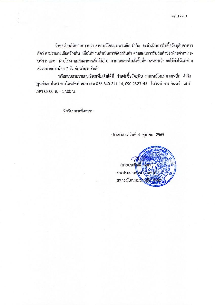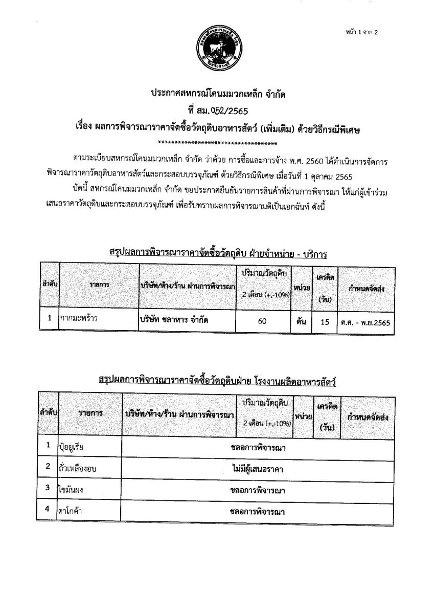 ประกาศ เรื่อง ผลการพิจารณาราคาจัดซื้อวัตถุดิบอาหารสัตว์ ด้วยวิธีกรณีพิเศษ ฉบับ(เพิ่มเติม)