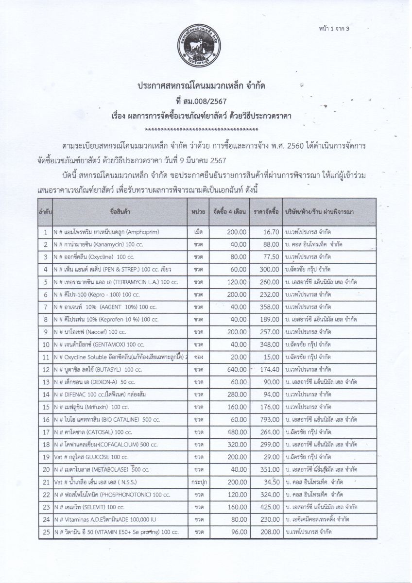 ประกาศ เรื่อง ผลการจัดซื้อเวชภัณฑ์ยาสัตว์ ด้วยวิธีประกวดราคา ระยะเวลา 4 เดือน (1 ธ.ค. 68 - 31 มี.ค. 69)