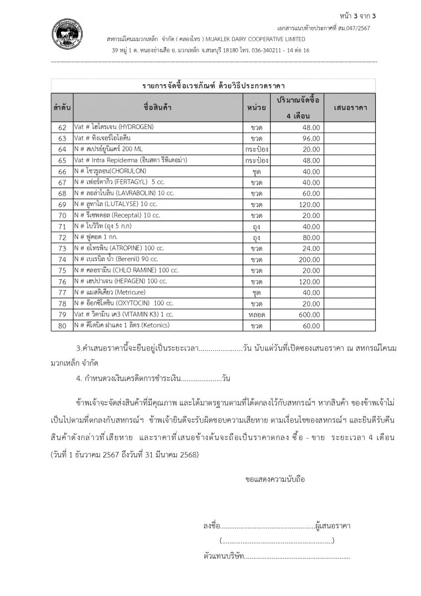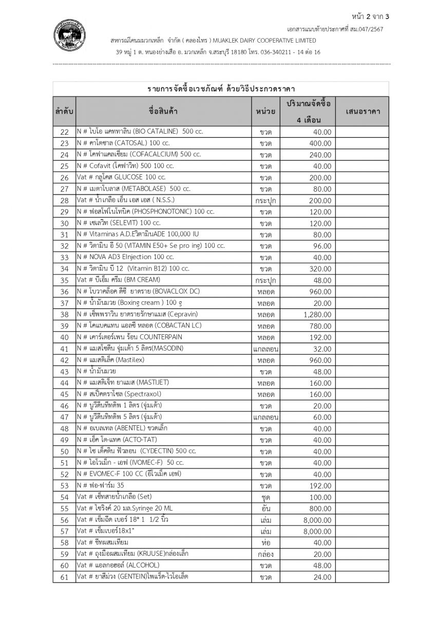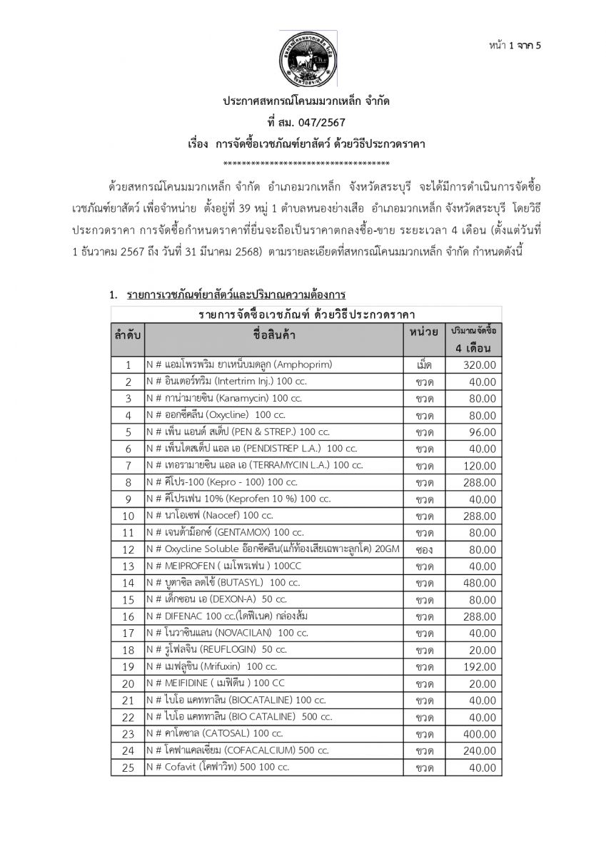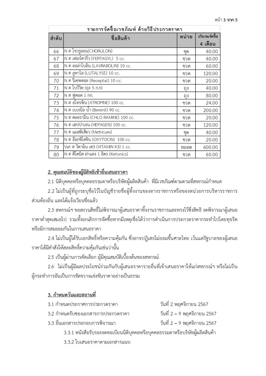 ประกาศ เรื่อง การจัดซื้อเวชภัณฑ์ยาสัตว์ ด้วยวิธีประกวดราคา ระยะเวลา 4 เดือน ( 1 ส.ค. - 30 พ.ย. 68 )