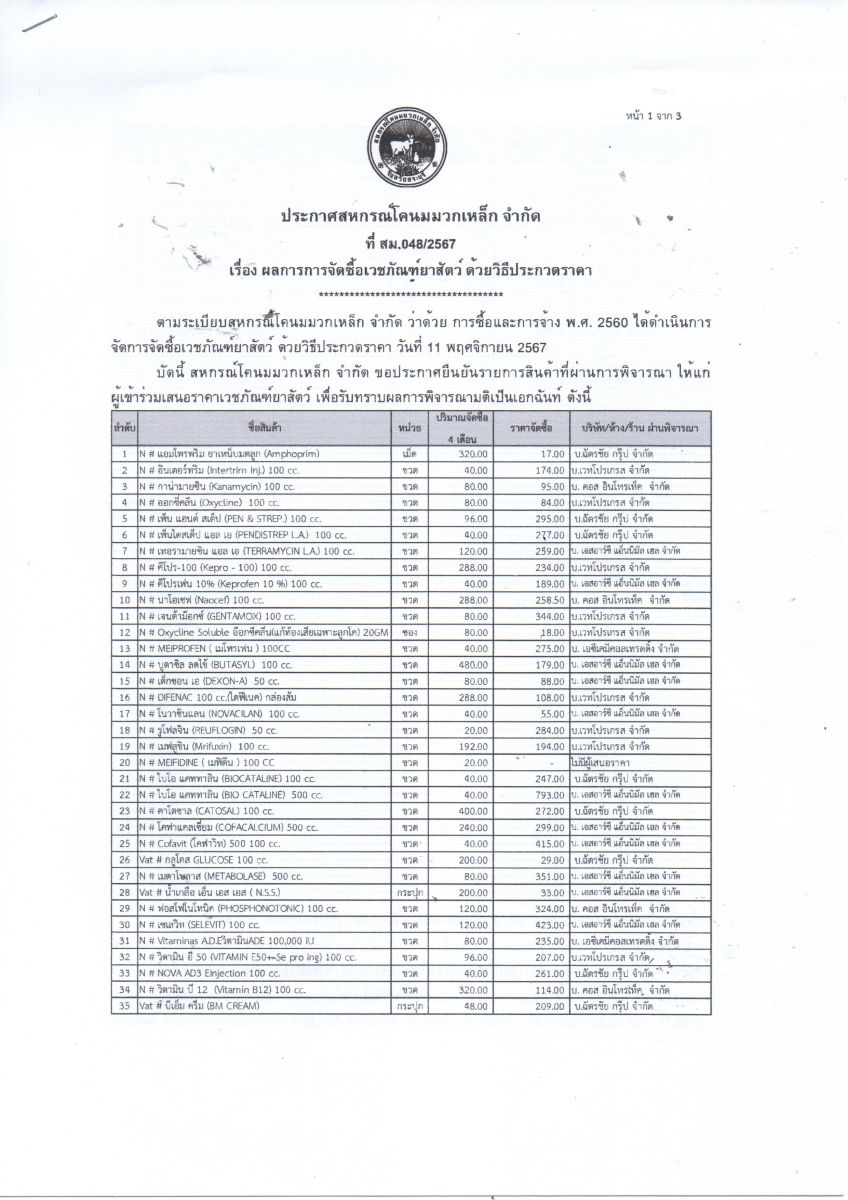 ประกาศ เรื่อง ผลการจัดซื้อเวชภัณฑ์ยาสัตว์ ด้วยวิธีประกวดราคา ระยะเวลา 4 เดือน (1 ธ.ค. 68 - 31 มี.ค. 69)