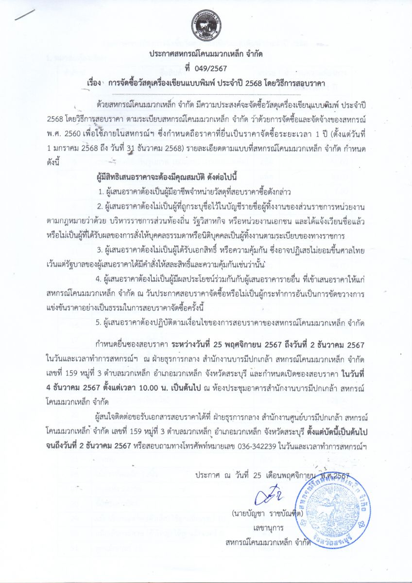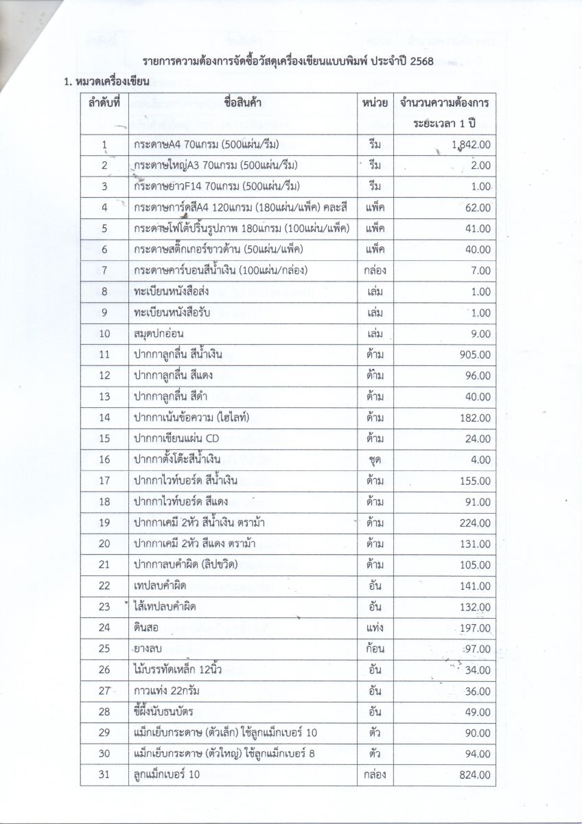 ประกาศ เรื่อง การจัดซื้อวัสดุเครื่องเขียนแบบพิมพ์ ประจำปี 2568 โดยวิธีสอบราคา