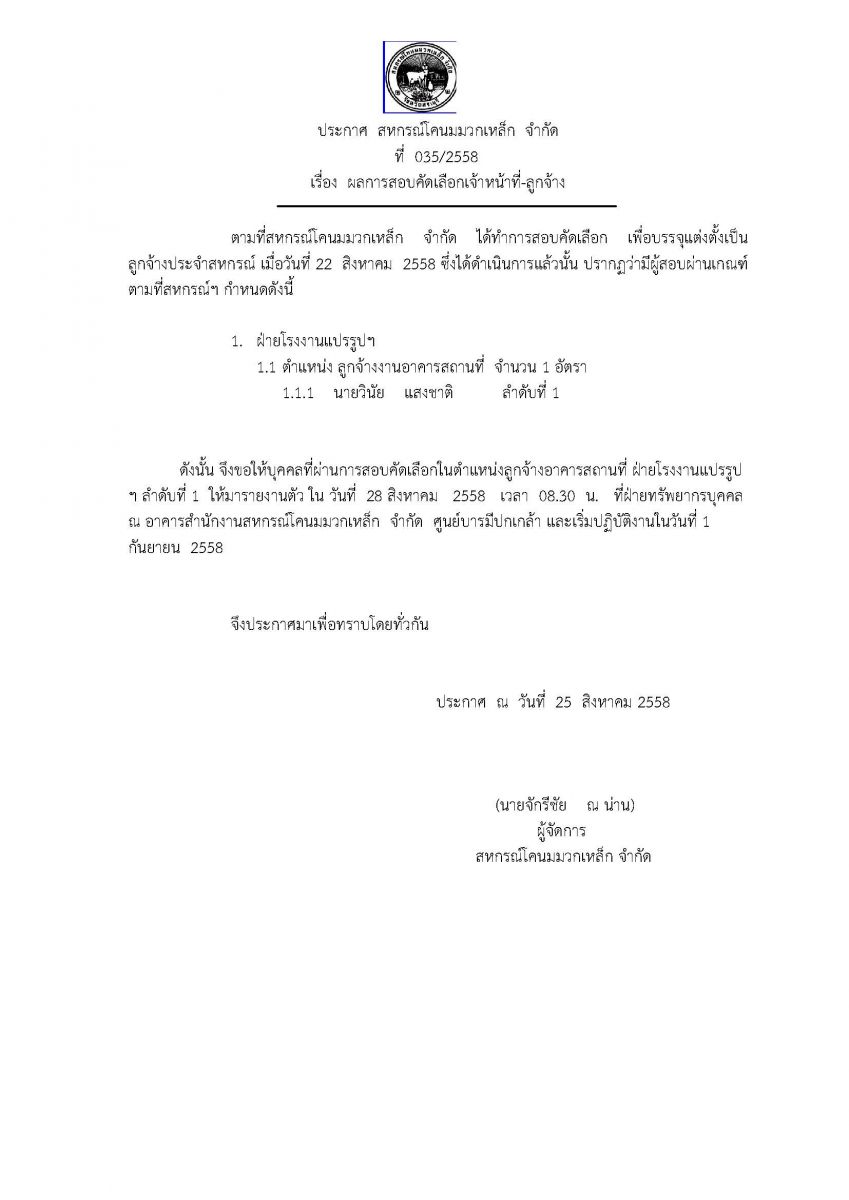 ประกาศผลสอบคัดเลือกเจ้าหน้าที่-ลูกจ้าง (ฝ่ายทรัพยากรบุคคล)