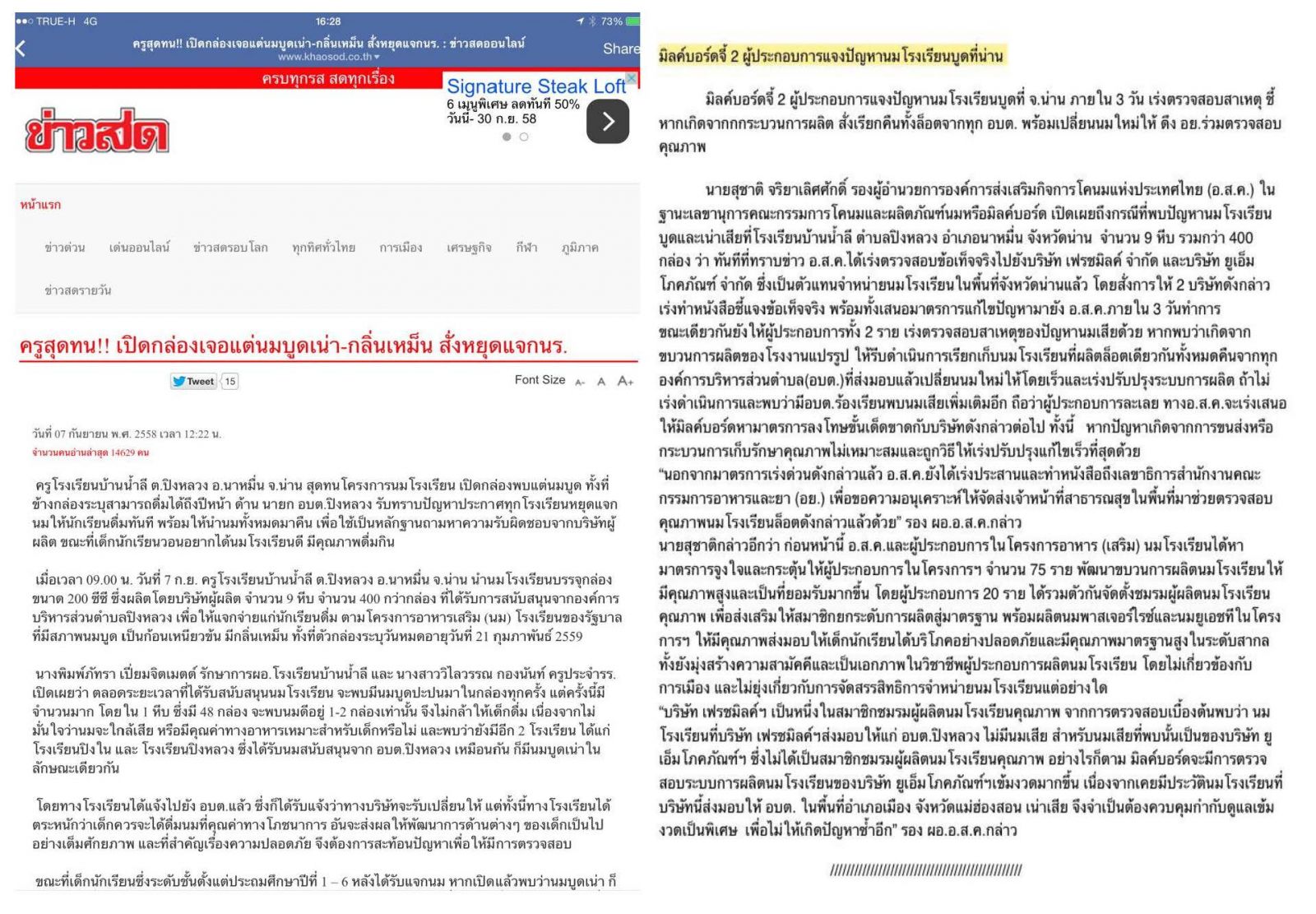มิลด์บอร์ดแจ้งผู้ประกอบการแจงปัญหานมโรงเรียนบูดที่น่าน