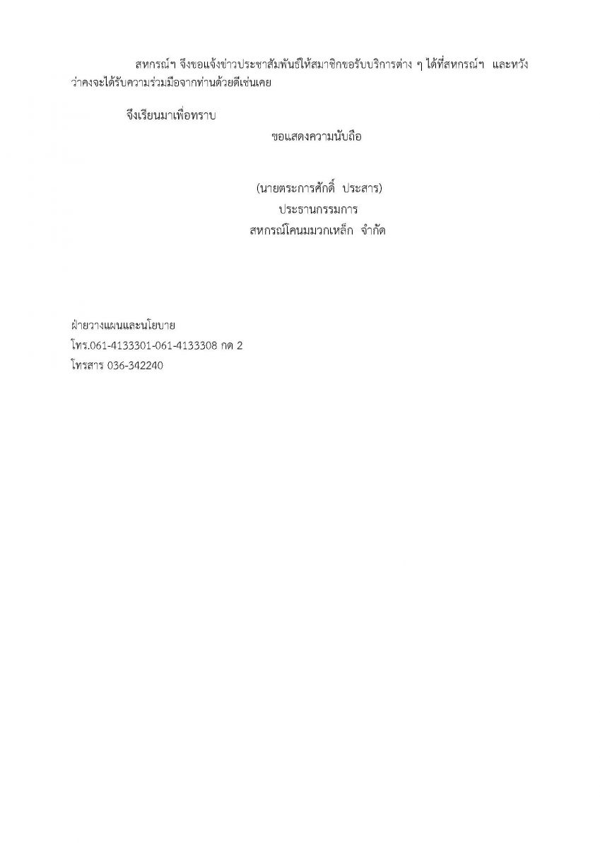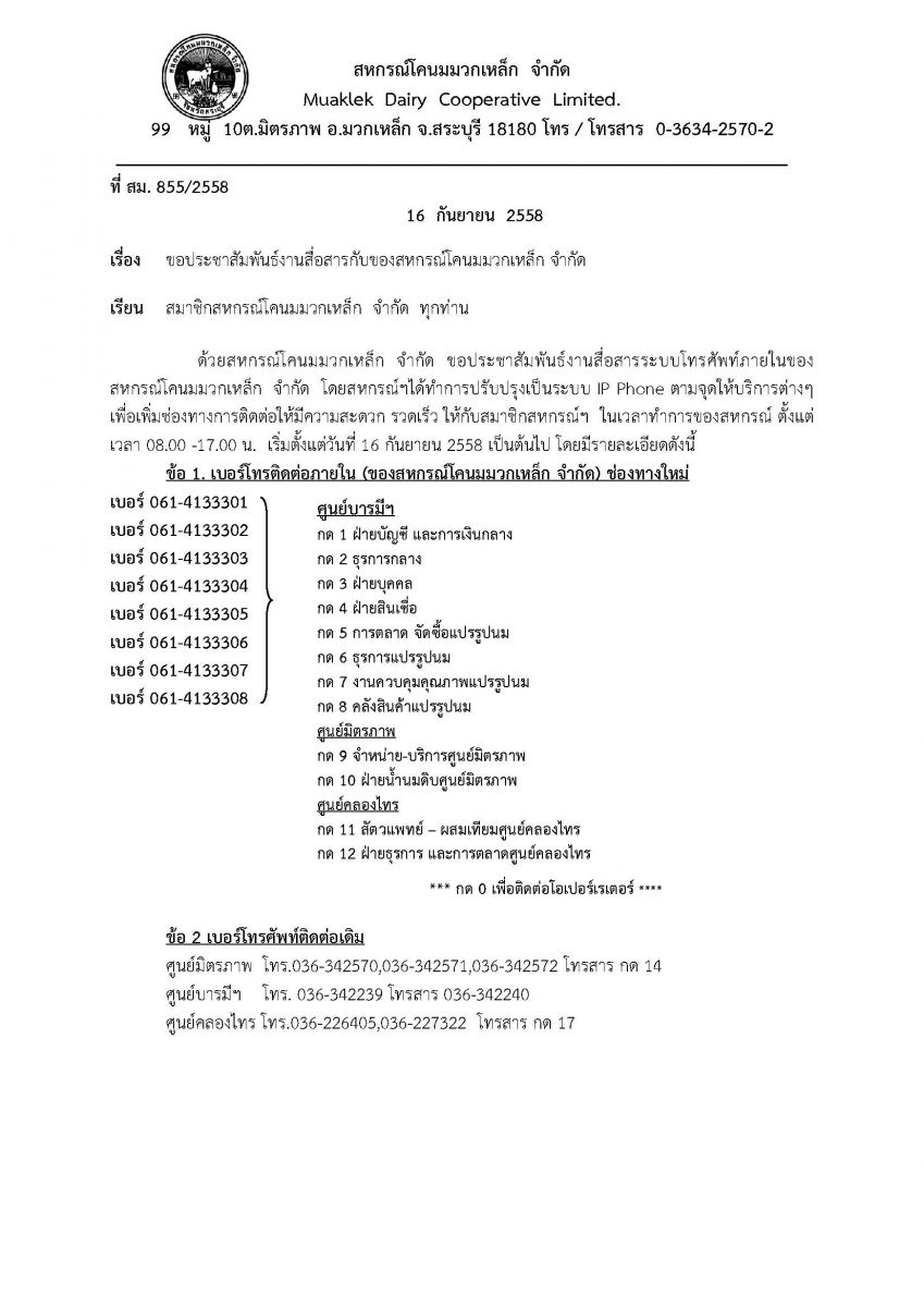 ประชาสัมพันธ์เบอร์โทรศัพท์ของสหกรณ์โคนมมวกเหล็ก จำกัด
