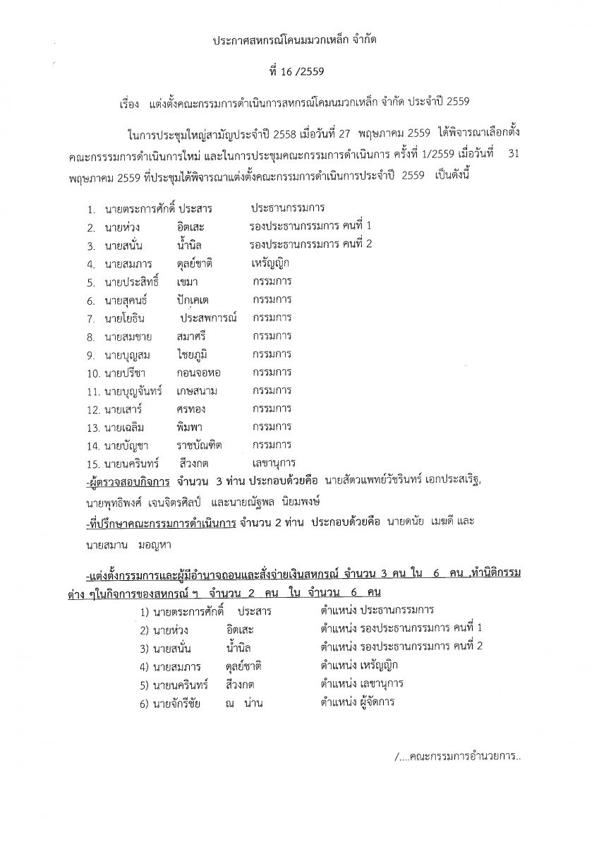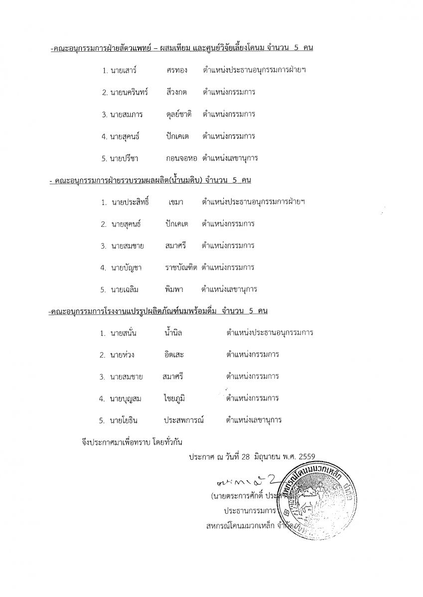 ประกาศแต่งตั้งคณะกรรมการของสหกรณ์โคนมมวกเหล็ก จำกัด ปี 2559