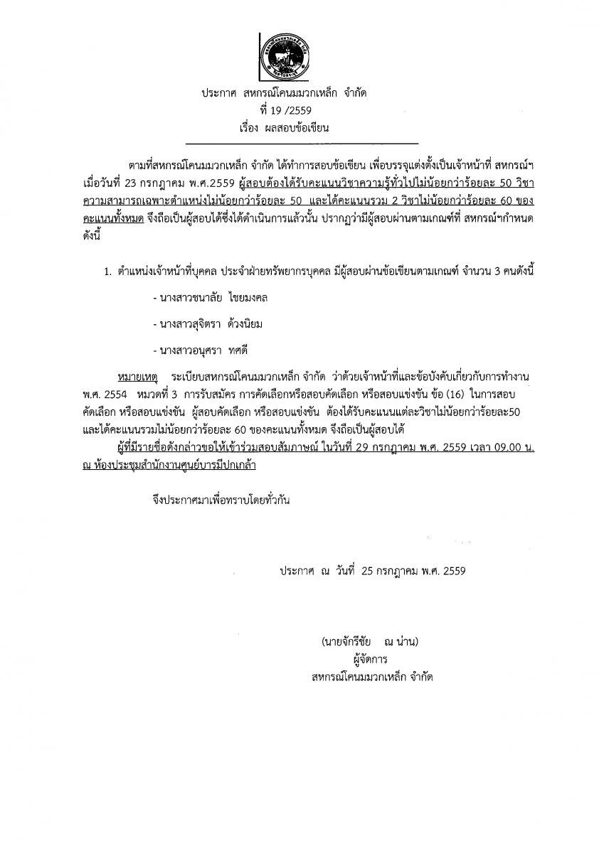 ประกาศผลสอบ ของสหกรณ์โคนมมวกเหล็ก จำกัด ตำแหน่งเจ้าหน้าที่บุคคล ประจำฝ่ายทรัพยากรบุคคล