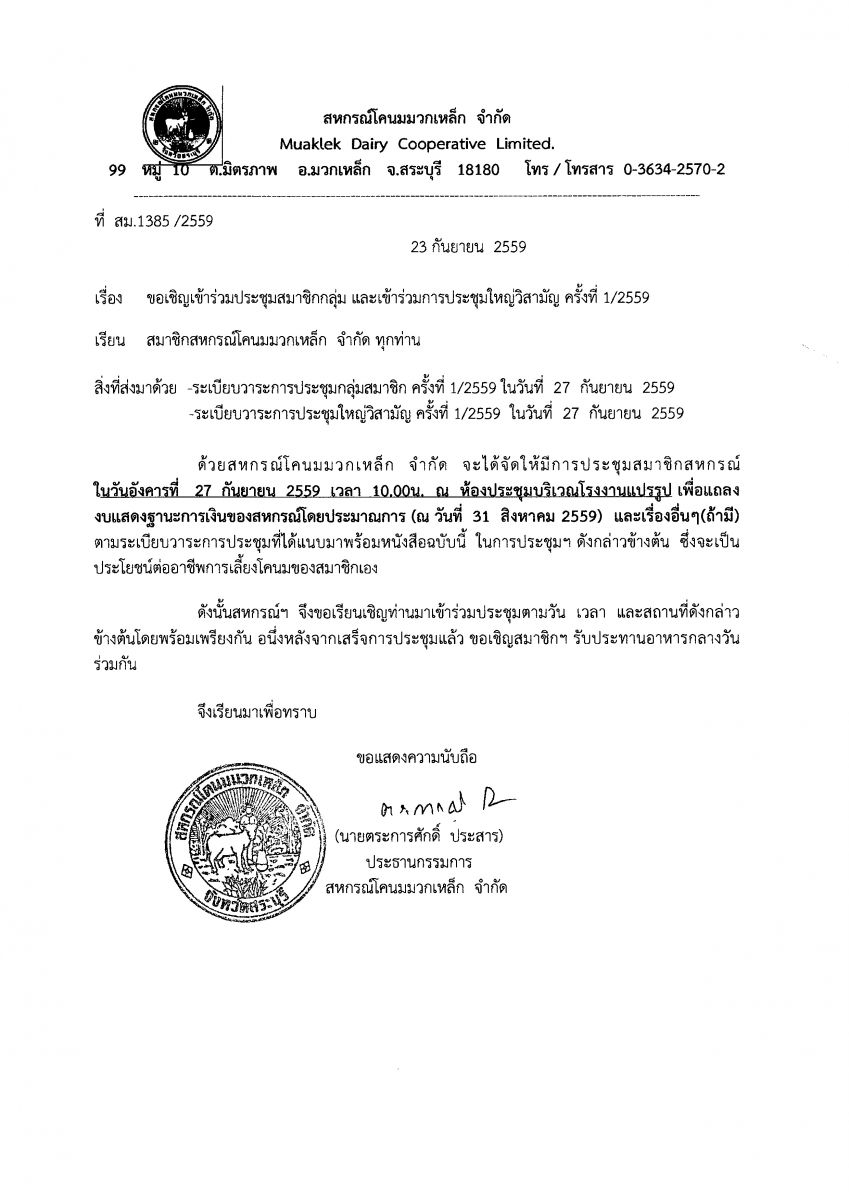 ขอประชาสัมพันธ์ถึงสมาชิกของสหกรณ์โคนมมวกเหล็ก จำกัด ขอเรียนเชิญเข้าร่วมประชุมสมาชิกกลุ่ม และเข้าร่วมการประชุมใหญ่วิสามัญครั้งที่ 1/2559