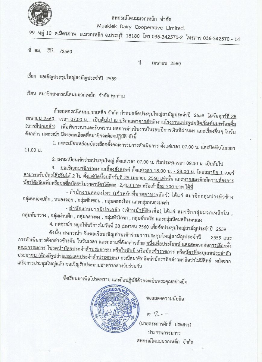 ขอเชิญประชุมใหญ่สมาชิก , การเลือกตั้งประธานกรรมการและคณะกรรมการ , การเปิดจำหน่ายโต๊ะจีน ประจำปีการเงิน 2559